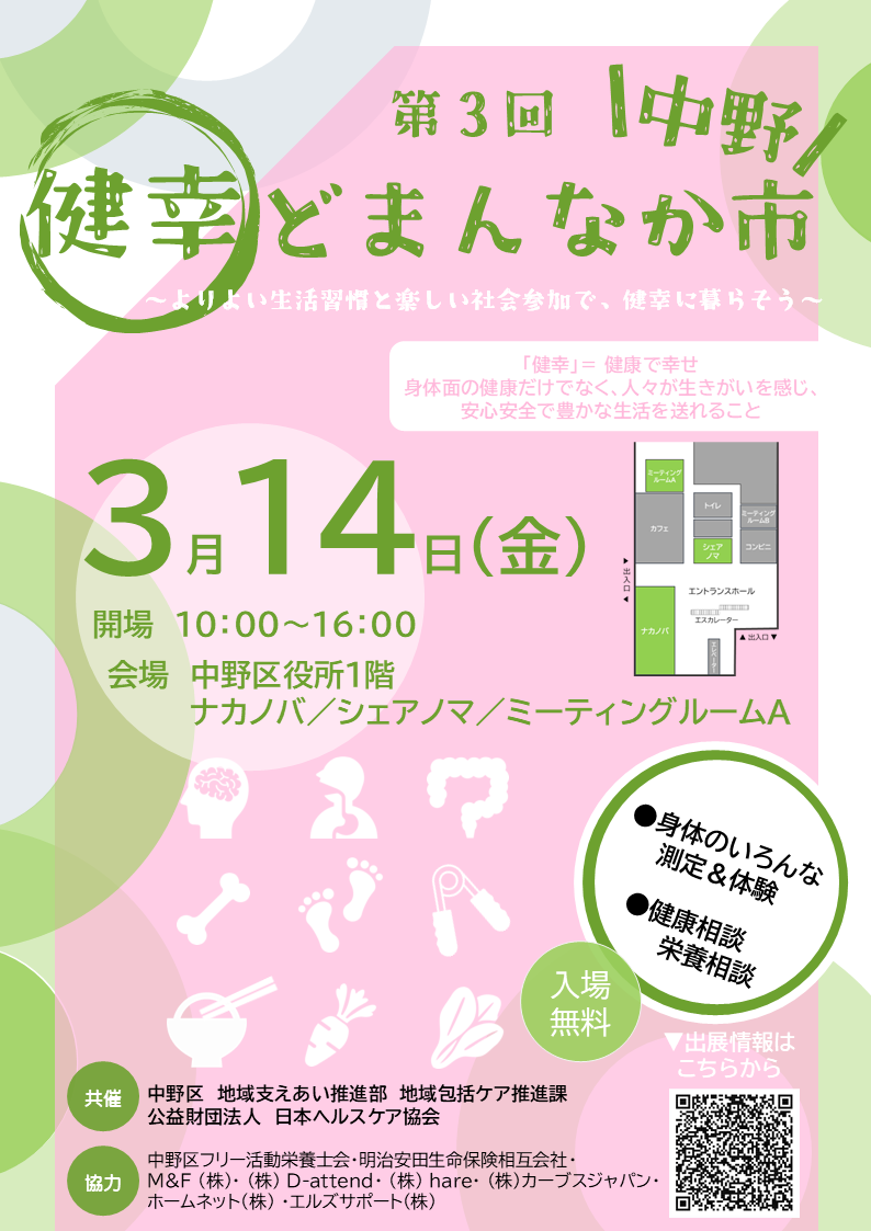 この度、中野区と地域包括ケア推進パートナーシップ協定を結んだ事業者が協力して開催する健康イベントに出店いたします。このイベントでは、専門家による健康相談や栄養相談、健康に役立つ体験会やセミナーなどが実施され、誰でも無料で参加することができます。