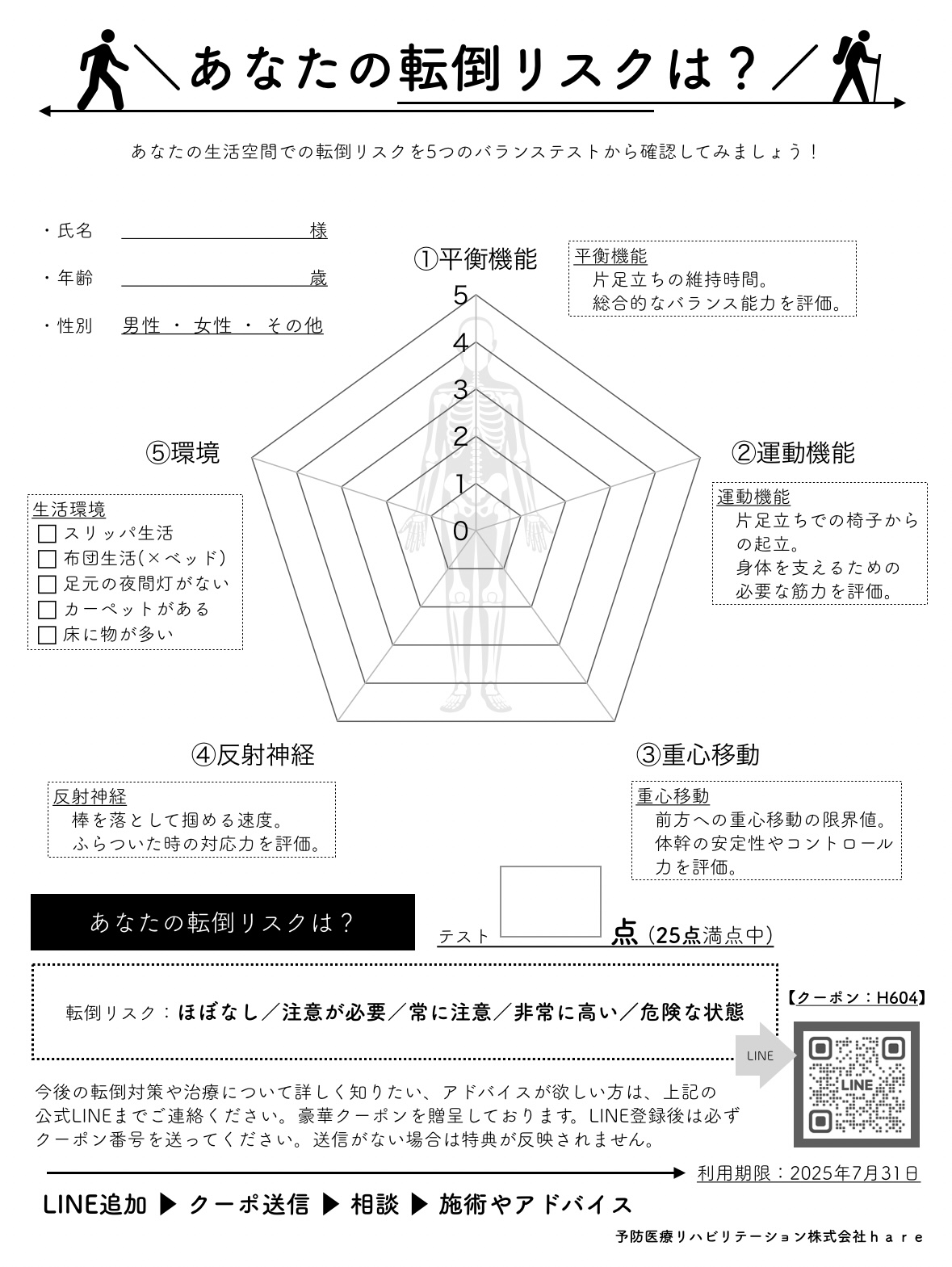 「転倒リスク診断(バランステスト)」以下の5項目、各項目5点の合計25点満点となります。