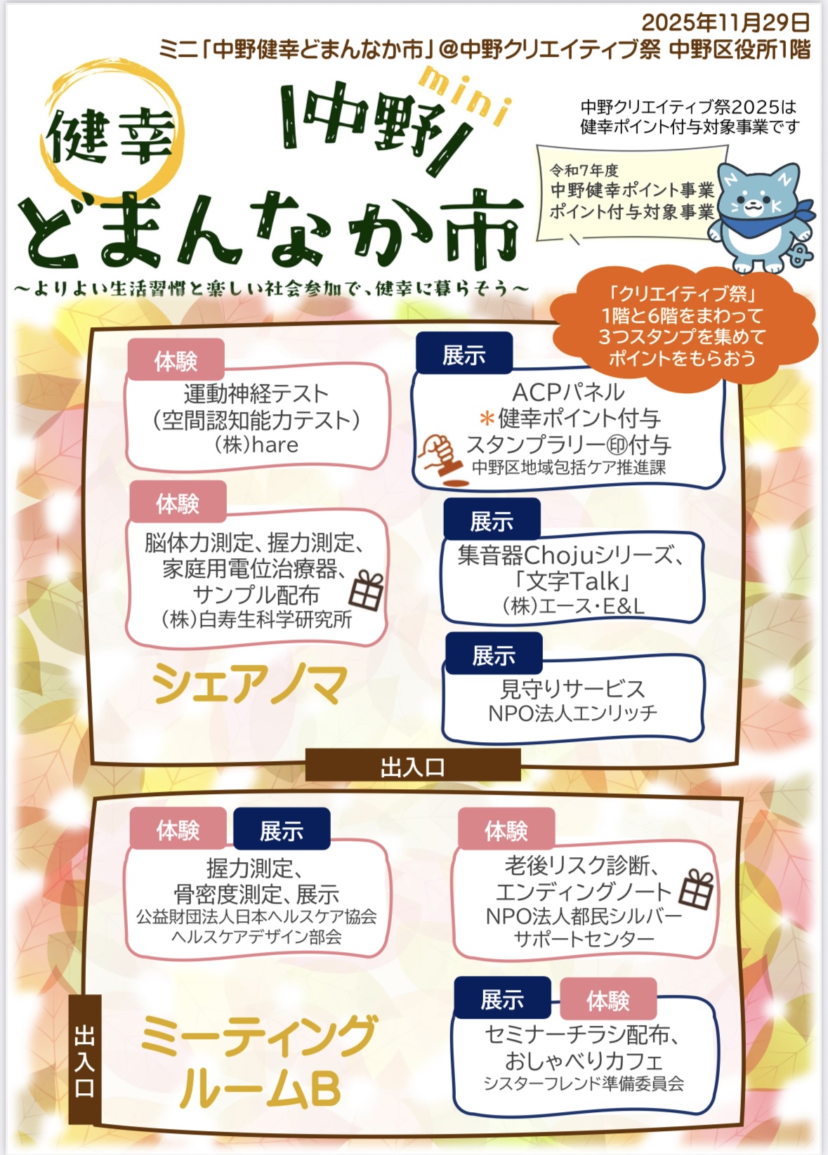 今回も、中野区と地域包括ケア推進パートナーシップ協定を結んだ事業者が協力して開催する健康イベントに出店させていただきます。このイベントでは、専門家による健康相談や栄養相談、健康に役立つ体験会やセミナーなどが実施され、誰でも無料で参加することができます。